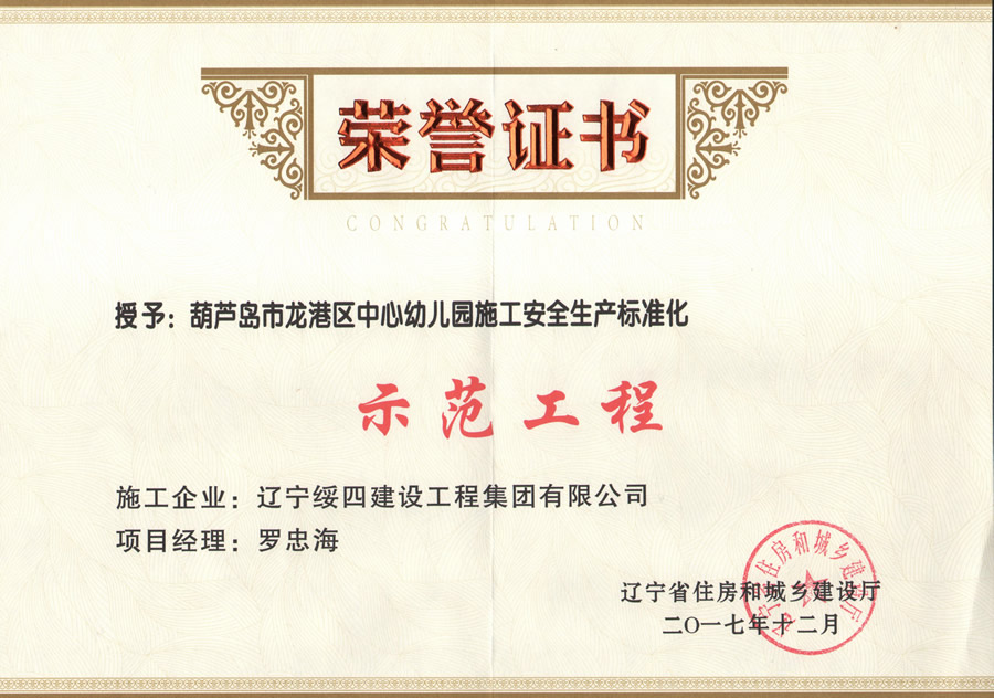 龍港區(qū)幼兒園施工安全生產(chǎn)標(biāo)準(zhǔn)化榮譽證書