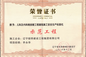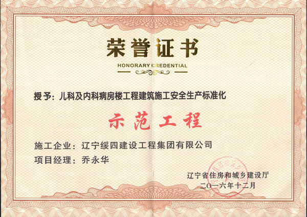 兒科及內(nèi)科病房標準化工程榮譽證書
