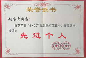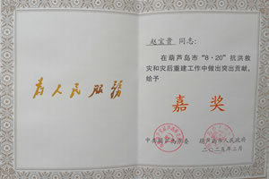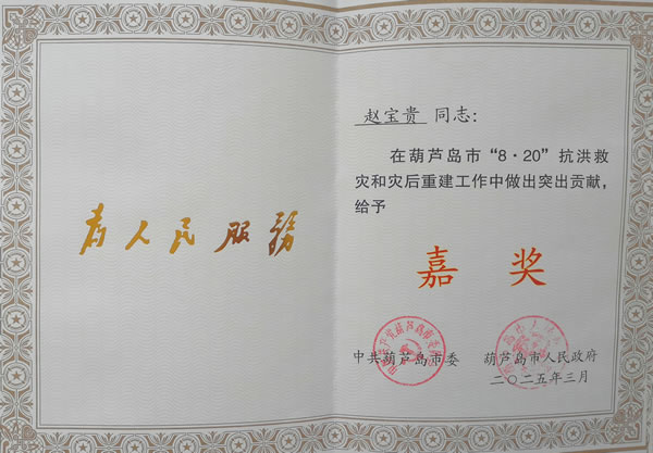 嘉獎:趙寶貴同志在葫蘆島市“8·20”抗洪救災(zāi)和災(zāi)后重建工作中做出突出貢獻