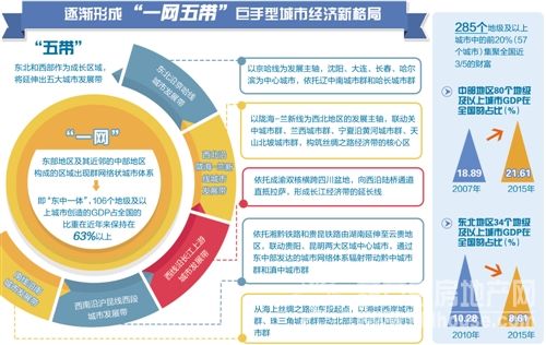 從城市層面GDP空間分布及變化來看,中國東中一體與“一網(wǎng)五帶”經(jīng)濟空間新格局進一步凸現(xiàn)。主要表現(xiàn)在:第一,中心城市的經(jīng)濟集聚引領(lǐng)作用進一步增強,285個地級及以上城市中的前20%(57個城市)集聚全國近3/5的財富。第二,中部地區(qū)憑借中心城市的有力支撐正在不斷崛起,東北地區(qū)由于中心城市支撐作用下降而出現(xiàn)持續(xù)下滑。第三,“一網(wǎng)五帶”的“巨手型”城市中國經(jīng)濟空間格局進一步顯現(xiàn)。東中部多中心城市群網(wǎng)中106個地級及以上城市創(chuàng)造的GDP占全國的比重在近年來保持在63%以上。西線沿長江上游城市發(fā)展帶GDP比重持續(xù)增加,2015年達到了6.28%,有趕超東北沿京哈線城市發(fā)展帶的可能。西北沿隴海蘭新線城市發(fā)展帶、西南沿滬昆線西段城市發(fā)展帶、南線沿海城市發(fā)展帶在全國的GDP比重盡管相對較小,但總體上呈增加趨勢。
