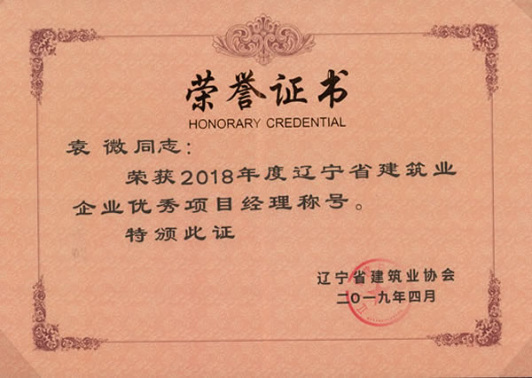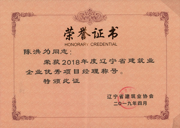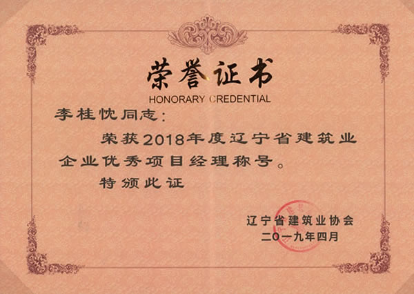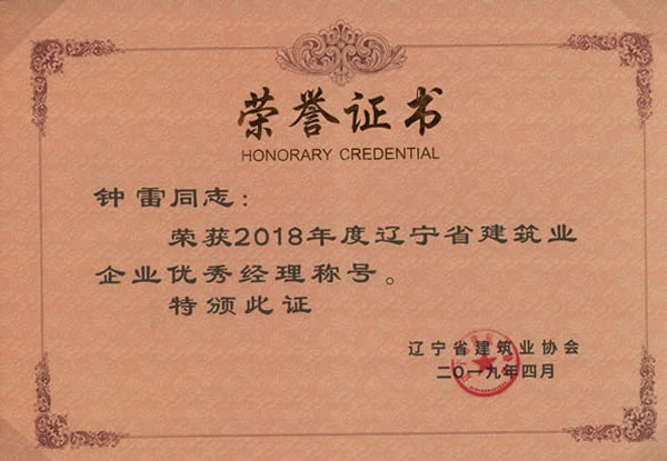 2019年5月22日,從遼寧省建筑業(yè)協(xié)會(huì)獲悉,我集團(tuán)榮獲2018年度“遼寧省建筑業(yè)優(yōu)秀企業(yè)”稱號(hào)。副總經(jīng)理鐘雷同志榮獲“遼寧省建筑業(yè)企業(yè)優(yōu)秀經(jīng)理”稱號(hào),項(xiàng)目經(jīng)理李桂忱、陳洪為、袁微三名同志榮獲“遼寧省建筑業(yè)企業(yè)優(yōu)秀項(xiàng)目經(jīng)理”稱號(hào)。