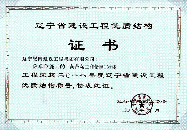 由企業(yè)自愿申報,有關(guān)單位擇優(yōu)推薦,遼寧省建筑業(yè)協(xié)會工程質(zhì)量管理分會組織專家組對工程復(fù)查并經(jīng)省建設(shè)工程質(zhì)量評審委員會審定,以及社會公示等一系列評價認(rèn)定。由我公司承建的“葫蘆島三和恬園13#樓”、“葫蘆島市第二高級中學(xué)改造項目教學(xué)實驗樓”工程被評為“2018年度遼寧省建設(shè)工程優(yōu)質(zhì)結(jié)構(gòu)”工程。