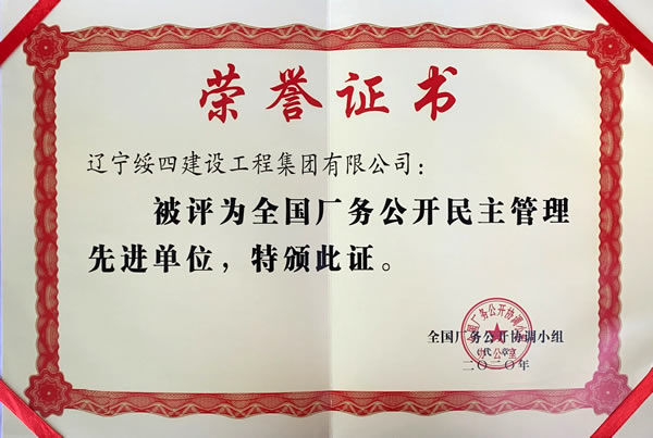 2020年8月,遼寧綏四建工集團喜獲“全國廠務公開民主管理先進單位”榮譽稱號。
