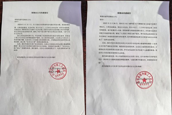 近期,綏中縣盛華園小區(qū)先后發(fā)生兩起火災(zāi)事故,所幸均被物業(yè)員工及時妥善處理,成功避免了重大人員傷亡和財產(chǎn)損失,綏中鎮(zhèn)工人社區(qū)居委會為此向盛華園物業(yè)公司發(fā)來感謝信,對兩位員工的英勇行為表示高度贊揚。