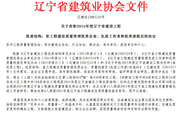 根據(jù)《遼寧省建設(shè)工程優(yōu)質(zhì)結(jié)構(gòu)審定辦法(2015年修訂)》(遼建協(xié)[2015]9號(hào))、《遼寧省工程建設(shè)質(zhì)量管理優(yōu)秀企業(yè)審定辦法(2015年修訂)》(遼建協(xié)[2015]10號(hào))文件精神,由企業(yè)自愿申報(bào),市擇優(yōu)推薦審核,省評(píng)審委員會(huì)審定,遼寧綏四建設(shè)工程集團(tuán)榮獲以下榮譽(yù)和獎(jiǎng)項(xiàng): (一)遼寧綏四建設(shè)工程集團(tuán)有限公司被評(píng)為2015年度遼寧省工程建設(shè)質(zhì)量管理優(yōu)秀企業(yè)。 。ǘ┘瘓F(tuán)榮獲省優(yōu)質(zhì)主體結(jié)構(gòu)獎(jiǎng)項(xiàng)工程: 1、綏中縣全民健身活動(dòng)中心; 2、葫蘆島市龍港區(qū)兩河三村回遷樓改造二期一標(biāo)段1#樓; 3、葫蘆島市龍港區(qū)兩河三村回遷樓改造二期一標(biāo)段2#樓; 4、葫蘆島三和榮郡1#住宅樓; 5、葫蘆島三和榮郡2#住宅樓; 6、葫蘆島三和榮郡3#住宅樓; 7、葫蘆島三和榮郡4#住宅樓; 8、葫蘆島三和榮郡5#住宅樓; 9、葫蘆島三和榮郡6#住宅樓; 10、葫蘆島三和榮郡7#住宅樓; 11、葫蘆島三和榮郡8#住宅樓; 我集團(tuán)將繼續(xù)認(rèn)真落實(shí)住建部關(guān)于工程質(zhì)量兩年治理行動(dòng)要求,創(chuàng)建出更多更好的精品工程,樹立企業(yè)品牌,為做強(qiáng)做大遼寧省建筑業(yè)的宏偉目標(biāo)作出新的貢獻(xiàn)。