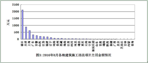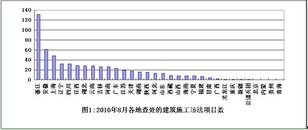 各地查處工作情況。從各地查處的違法工程項(xiàng)目數(shù)量看,浙江、安徽、上海3省(市)查處力度較大,分別查處項(xiàng)目131個(gè)、61個(gè)、48個(gè)(見圖1)。