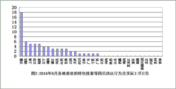 從查處的轉(zhuǎn)包、掛靠等四類違法行為看,安徽、湖北省查處項(xiàng)目相對較多(見圖2)。