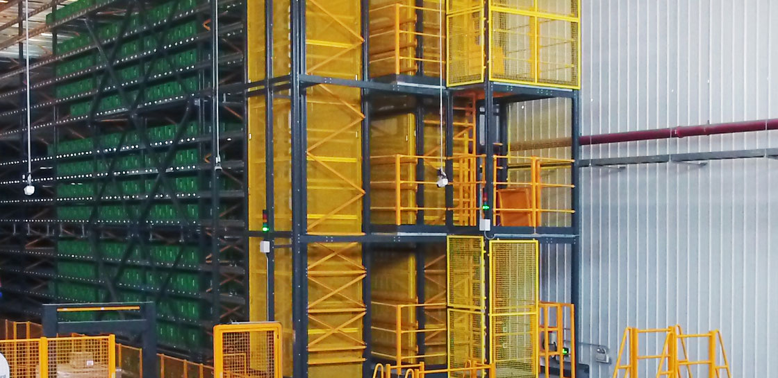提升機(jī)用于在垂直方向上搬運料箱/穿梭車,使料箱/穿梭車快速到達(dá)不同層高的貨架位置。