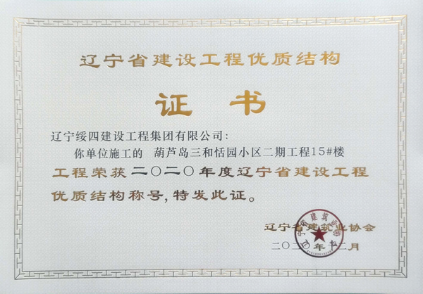 “葫蘆島三和恬園小區(qū)二期工程15#樓”榮獲2020年度遼寧省建設(shè)工程優(yōu)質(zhì)結(jié)構(gòu)稱號(hào)
