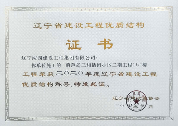 “葫蘆島三和恬園小區(qū)二期工程16#樓”榮獲2020年度遼寧省建設(shè)工程優(yōu)質(zhì)結(jié)構(gòu)稱號(hào)
