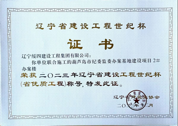 | 葫蘆島市紀(jì)委監(jiān)委辦案基地建設(shè)項(xiàng)目2#辦案樓 榮獲2023年遼寧省建設(shè)工程世紀(jì)杯(省優(yōu)質(zhì)工程)稱(chēng)號(hào) |